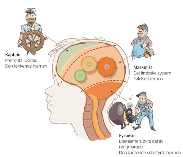 Jeg sliter litt med å ta den fram i timen med klientene nå, da den begynner å bli avlegs. Hjernen er langt mer kompleks, og nyere forskning viser hvor ufullstendig denne modellen er for å beskrive menneskers følelser og handlinger.